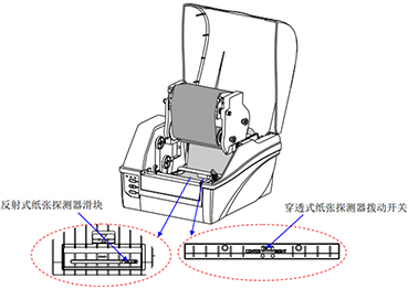 调整纸张探测器。对于反射式纸张探测器,打开纸张探测器盖后,您可以通过移动纸 张探测器滑 块,调节纸张探测器到合适位置;对于穿透式纸张探测器,您可以通过拨动纸张探测器上的开关,选择居中或者偏右探测,偏右位置与居中位置之间的距离为8mm。